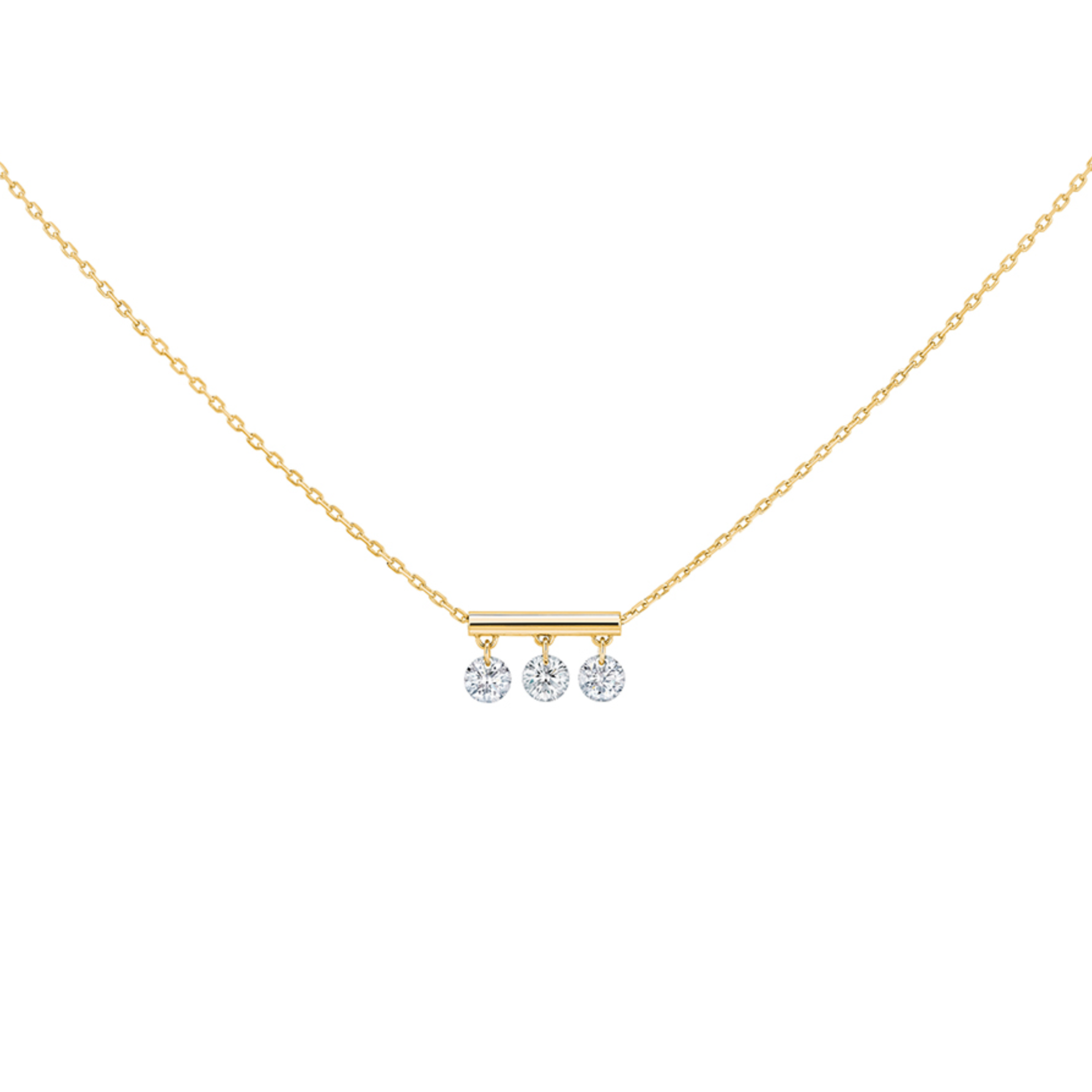 The Floating Diamond Bar Necklace is handcrafted in 18k gold and diamonds. It features three drilled diamonds in a line dangling magically on a bar.