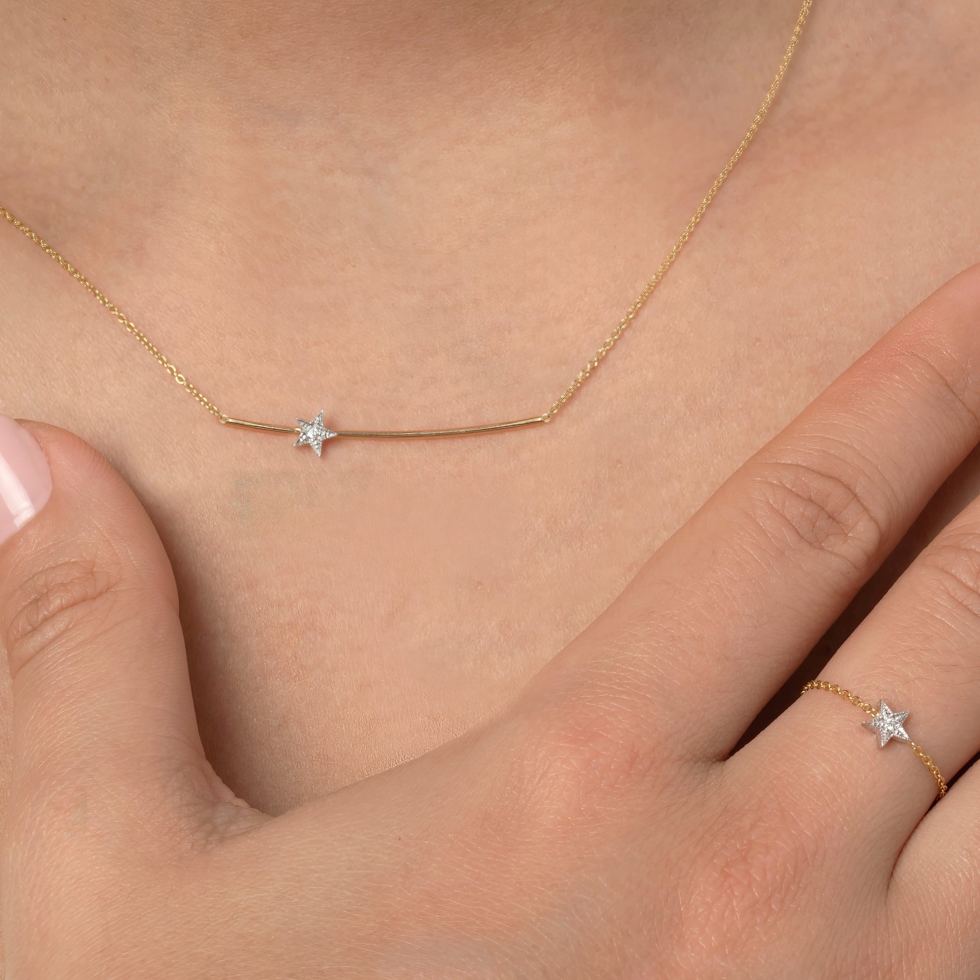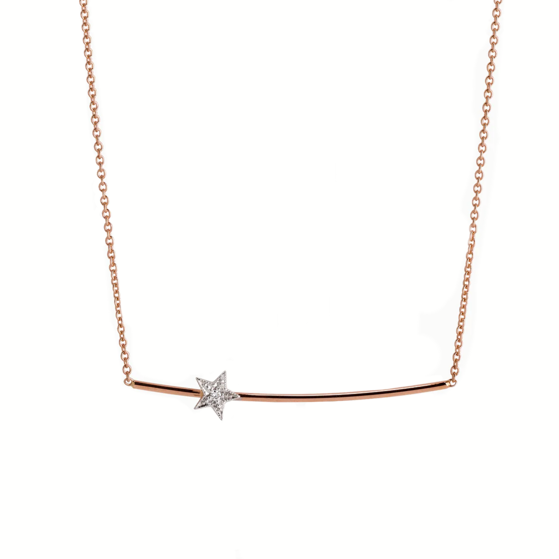 The Etoile Bar Diamond Necklace is crafted in 18K Gold. It features a white gold diamond star set on a bar. Available in Yellow Gold and in Rose Gold.